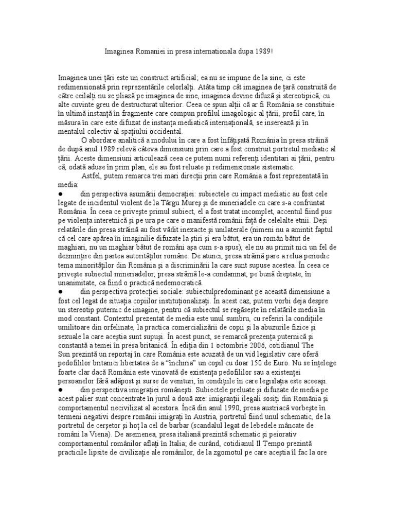 vizita?i articolul complet aici : https://ro.scribd.com/doc/44641016/Imaginea-Romaniei-in-Presa-International-A-Dupa-1989 Reflectarea fenomenului de violenta in presa scrisa. Presa din sua scria despre un reportaj difuzat pe postul de televiziune abc, in care arata ca orfanii romani traiesc in conditii mizere. Indatorarea si saracirea romaniei a fost programata cu mult timp inainte de a se desmetici romanii.