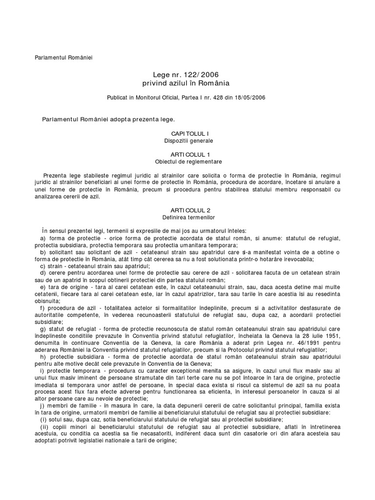 vizitati articolul complet aici : 2 122 din 4 mai 2006. Legea 122 din 2006 privind azilul legea 122 din 2006 privind azilul in romania.pdf. 122/2006 privind azilul în românia, cu modificările şi completările ulterioare, până la data.