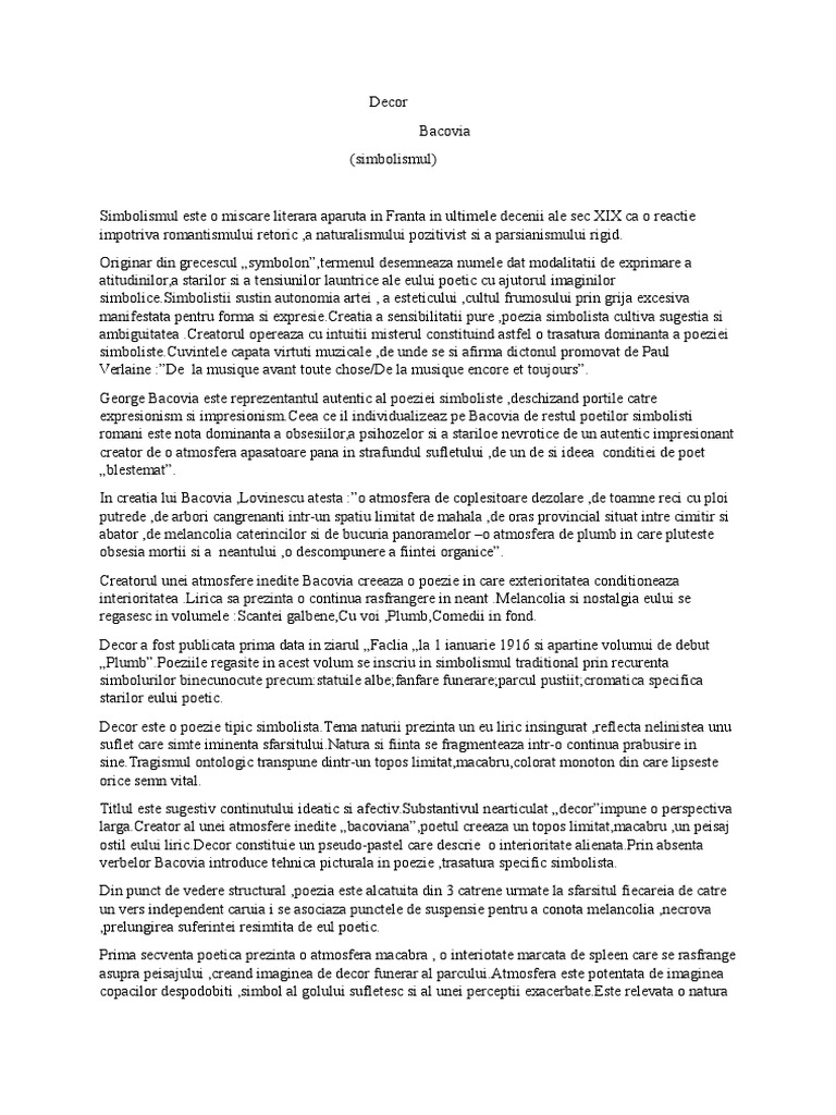 Comentariu care tratează simbolismul în poezia decor scrisă de poetul român george bacovia. Chiar și cu această metodă veche trebuie să fie un cunoscător, întrucât ai nevoie de experiență pentru a prinde vibrațiile crengii. Pentru un scriitor, orice fiintä lucru capätä fetele nesfârsite ale eului